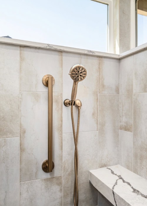 The added niche and hooks on the half-wall between the shower and makeup vanity add practicality, while the pretty tile is like a secret little gem for our client. The symmetrical mirrors are custom-framed to fit perfectly between the vanity tower and walls. Burnished brass fixtures add elegance to the space, and simple framing around the window highlights the stunning treeline view. The stone bench in the shower provides comfort and practicality for long-term use of the space.
